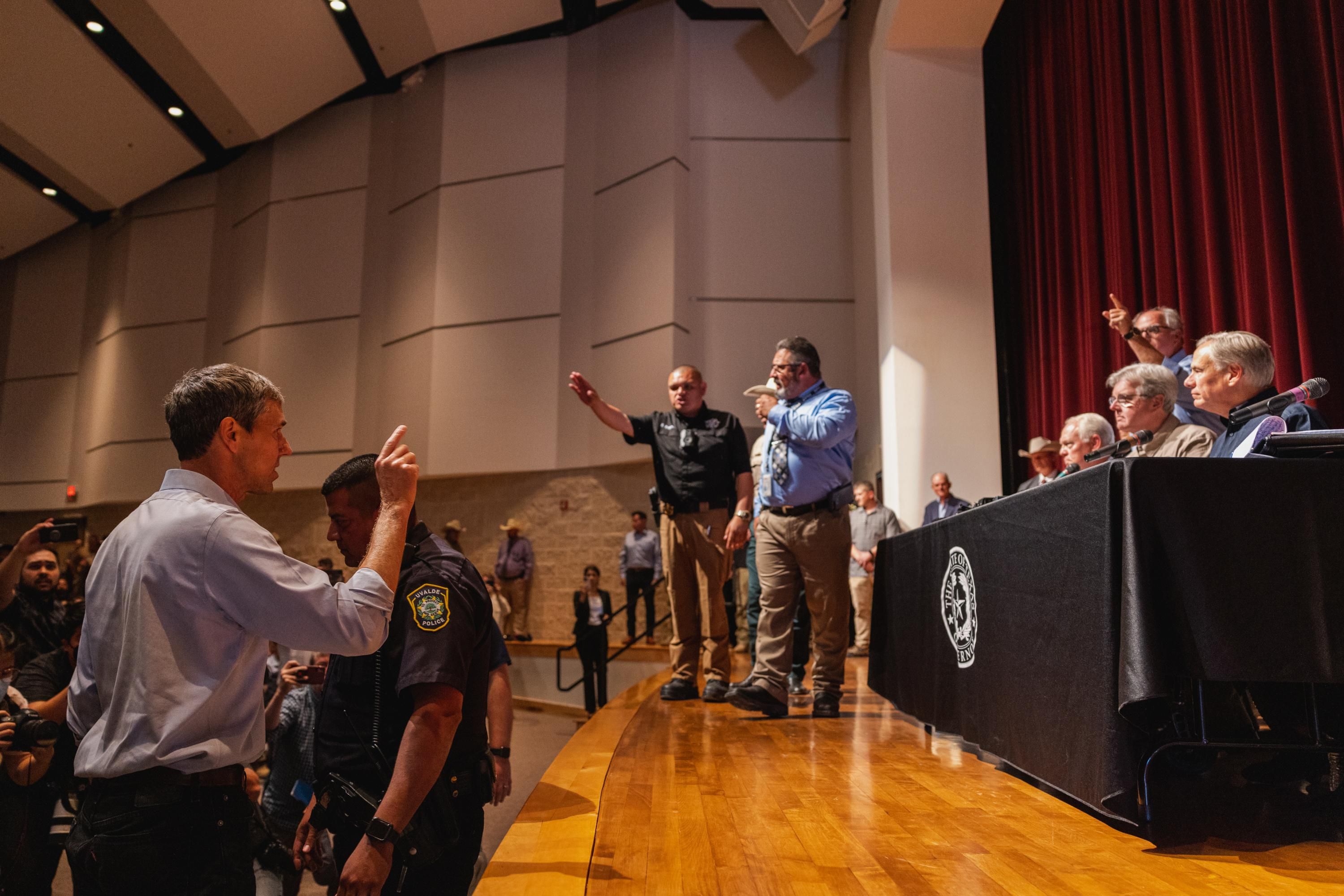 At one point, Flash walks toward the back of the meeting room, and has a whispered conversation with an officer — identified by the Texas Tribune as Sheriff Victor Lopez — about taking his photo. After Lopez leaves the room, Sheriff’s Deputy Adriana Ruiloba confronts Flash, telling him, “Don’t come in my personal space,” and ordering him to “back off.”